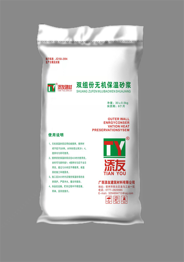 雙組份無(wú)機(jī)保溫砂漿品牌:添友TY 品名:雙組份無(wú)機(jī)保溫砂漿 凈重:30kg左右 使用范圍:各種室內(nèi)、外墻保溫工