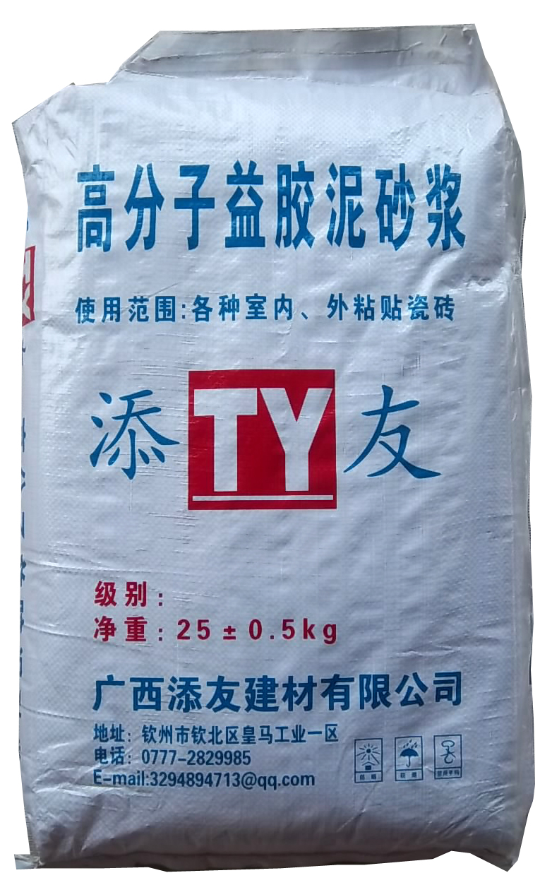 高分子益膠泥砂漿品牌:添友TY 品名:高分子益膠泥砂漿 凈重:25kg左右 使用范圍:各種室內(nèi)、外粘貼瓷磚